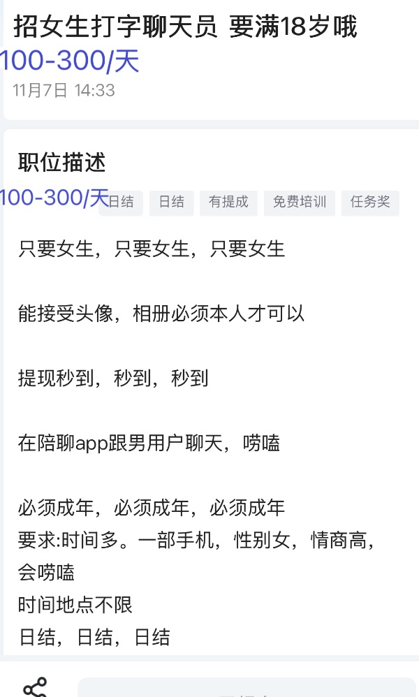 招女生打字聊天员、要满18岁哦100-300/天 [2025/12/2 16:25:00]